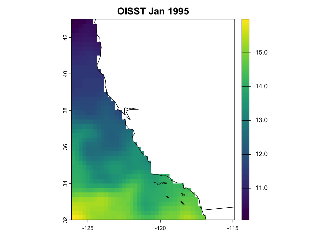 Whether data are referred to as observations depends on who you to talk to. For the purposes of our workshop, and as marine ecologists, we refer to OISST as our ‘observed’ data set, because it represents ‘real-life’ SST. However, sea-going physical oceanographers might not refer to OISST as observations, because the product represents a series of observations obtained from different platforms (i.e., ARGO, moorings, satellites, ship-borne sensors etc.) that have been ‘modeled’ or ‘interpolated’ into a gridded, cloud-free product. Technically, OISST represents a modeled product based on observations. Rather, they would refer to observations as the raw, unprocessed data coming from sensors themselves. Just something to keep in mind when talking to people from different disciplines.