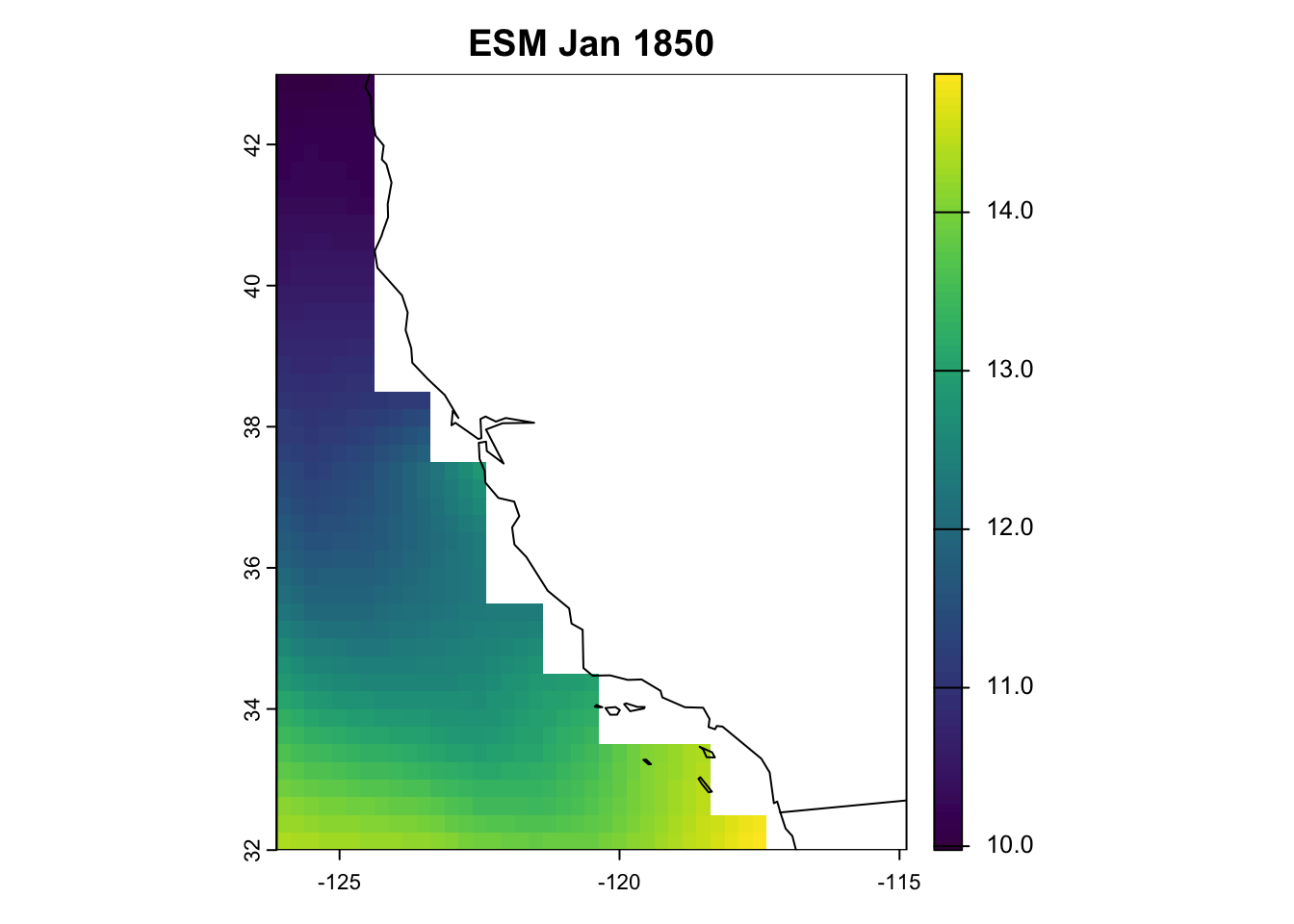 As with the ESMs, we need to preprocess them. However, OISST are provided as daily files, so we need to calculate monthly averages so they are comparable with our projections. We do this using the -mergetime and monmean operators. Then, as with the ESMs, we need to crop and remap the OISST fields to the same resolution and extent and off the California coast.